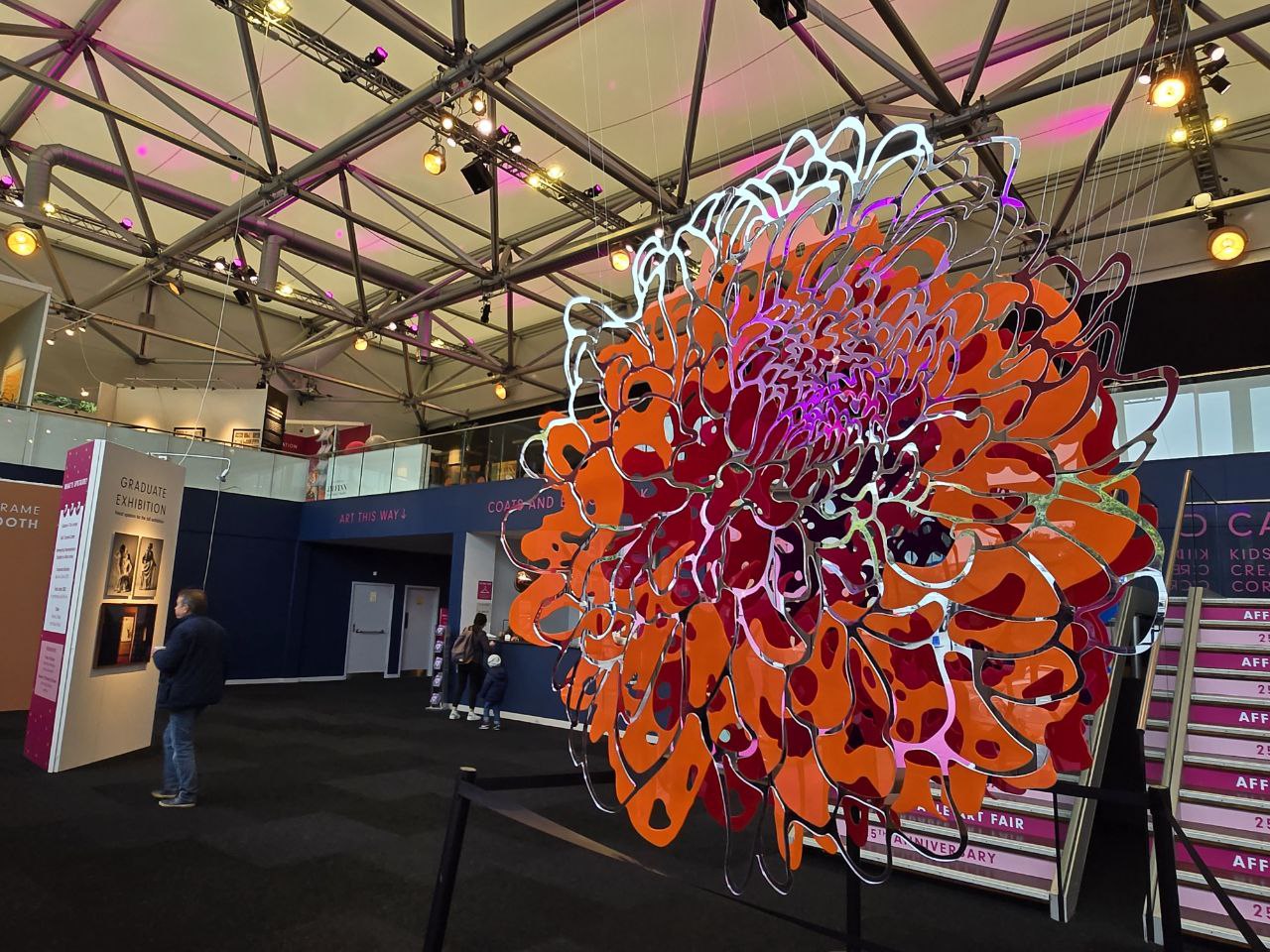 현대 미술의 다양성을 보여주는 이번 박람회에서는 회화, 조각, 사진, 디지털 아트 등 여러 장르의 작품이 선보였습니다. 입구에서는 헬렌 브로우(Helen Brough) 작가의 화려한 테크니컬러 설치 작품이 방문객들을 맞이하며, 독창적이고도 환상적인 분위기를 연출했습니다.